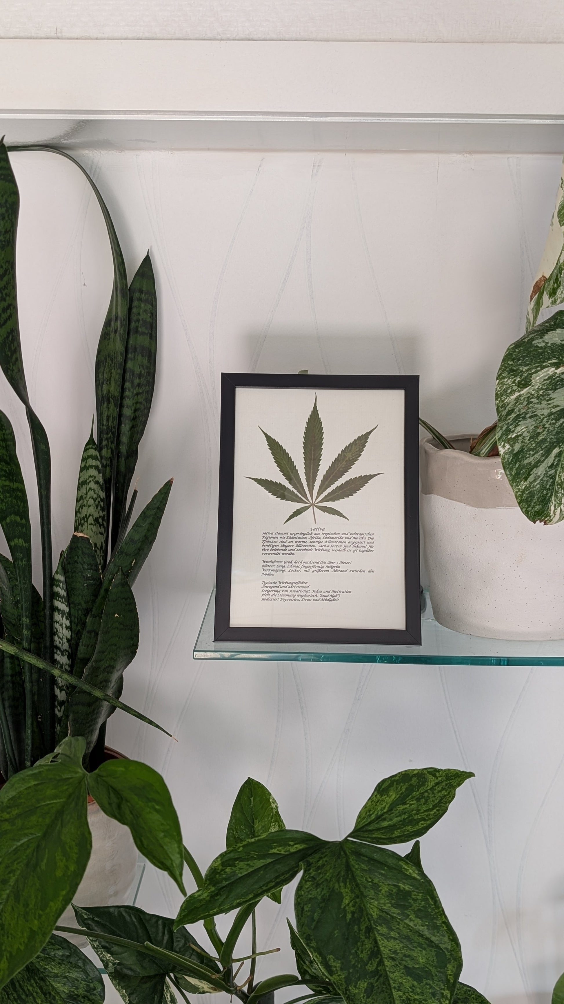 Dieses außergewöhnliche Kunstwerk bringt ein Stück Natur direkt an deine Wand. Das echte, handgepresste Cannabisblatt wird in einem schlichten Rahmen präsentiert und verleiht jedem Raum einen Hauch von Natürlichkeit und Individualität.