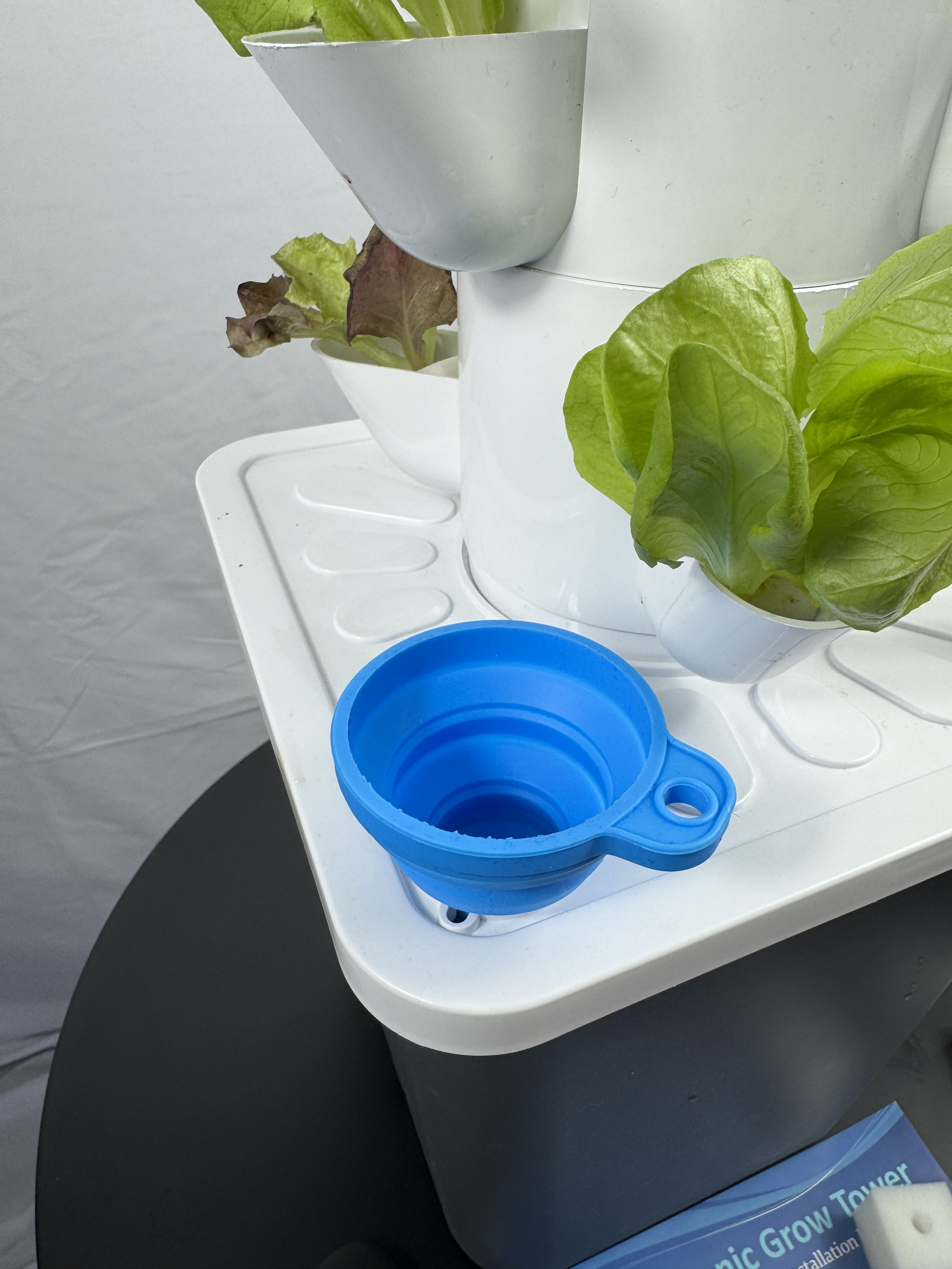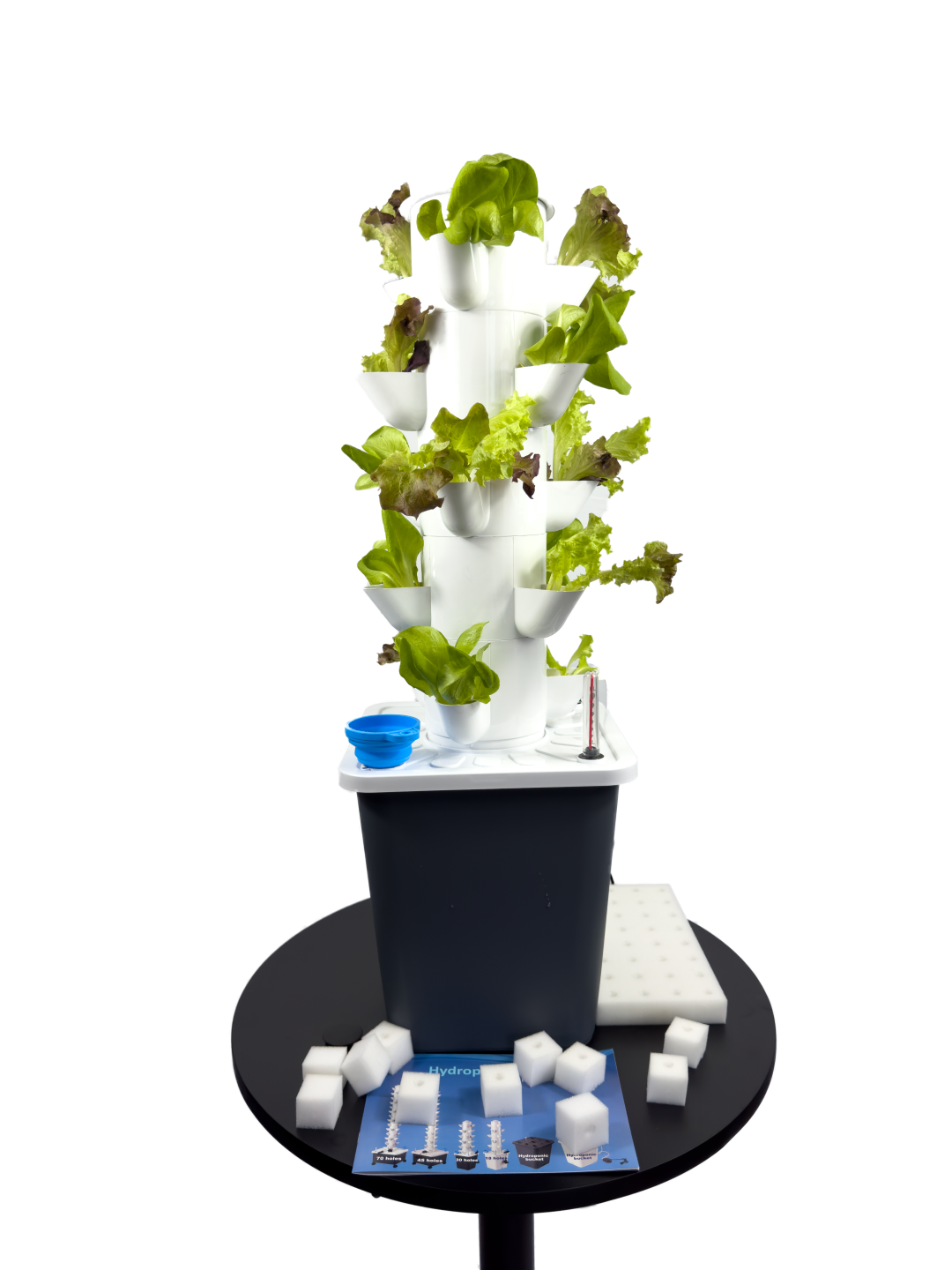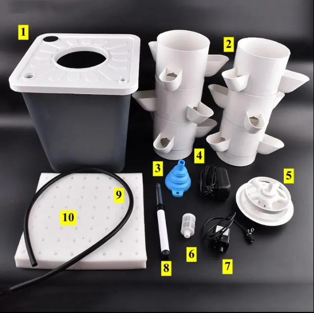 Inhalt: 5 Ebenen des Pflanzturms, Wasserpumpe inkl. Netzteil, Wassertank 10l, Trichter, Wasseranzeige, Schläuche und detaillierte Anleitung